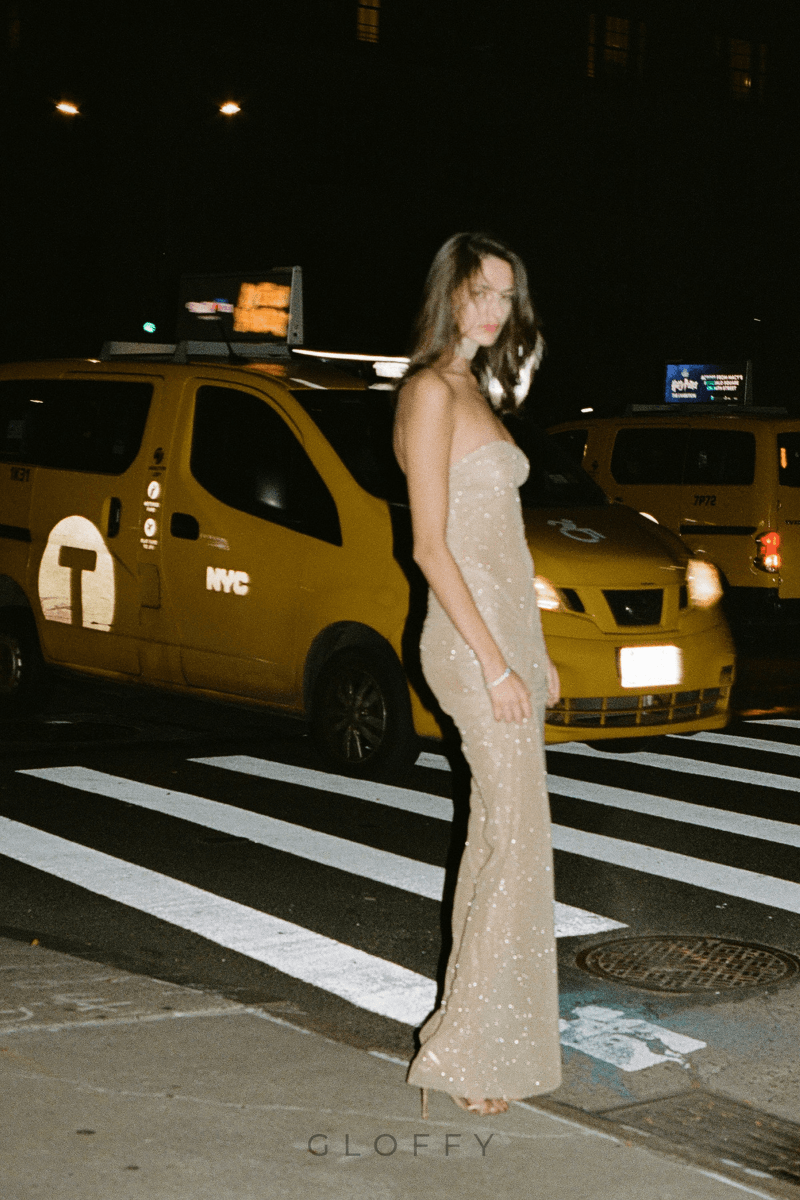 - Tasarım: Payetli ve balık etekli, straplez bedene oturan elbise