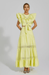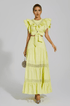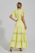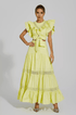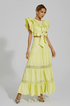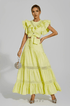 Bu sonbahar setinde, yüksek belli dökümlü bir etekle eşleştirilmiş şık, volan kollu bir üst kısım bulunuyor. Zarif kıvrımlı kollar tuhaf bir dokunuş katarken, kravat detayı belinizi güzelleştirerek hoş bir silüet sunar.