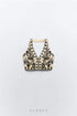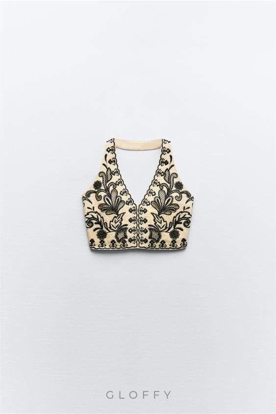 Şık V yakalı ve zarif nakış detaylarına sahip bu boyundan bağlamalı kısa üstle gardırobunuzu yükseltin. Ayna efektli aplike cazibeli bir dokunuş katarak onu hem gündüz hem de gece etkinlikleri için mükemmel kılıyor.