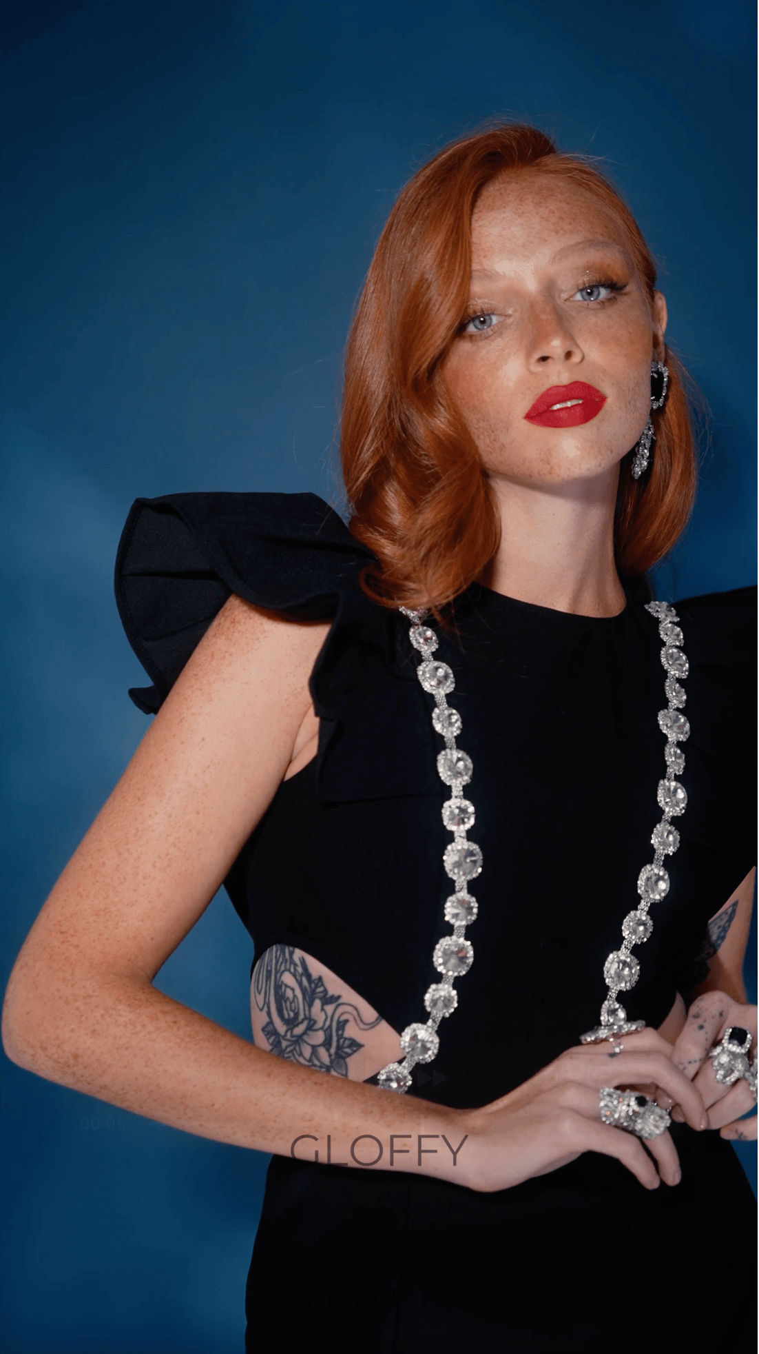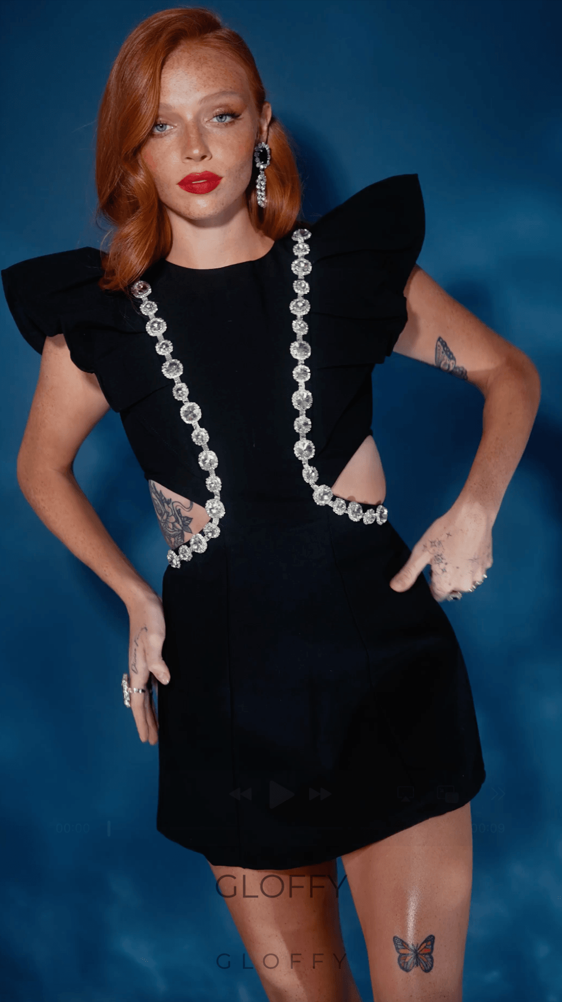 Stil Notu: Işıltılı kristal detaylarla cesur bir zarafet sunan bu mini elbise, gece davetleri ve özel anlar için mükemmel bir tercih. Omuzlarda dramatik volanlar ve yan bel kesikleriyle dikkat çekerken, bedeni saran formuyla vücut hatlarını zarifçe vurgular.