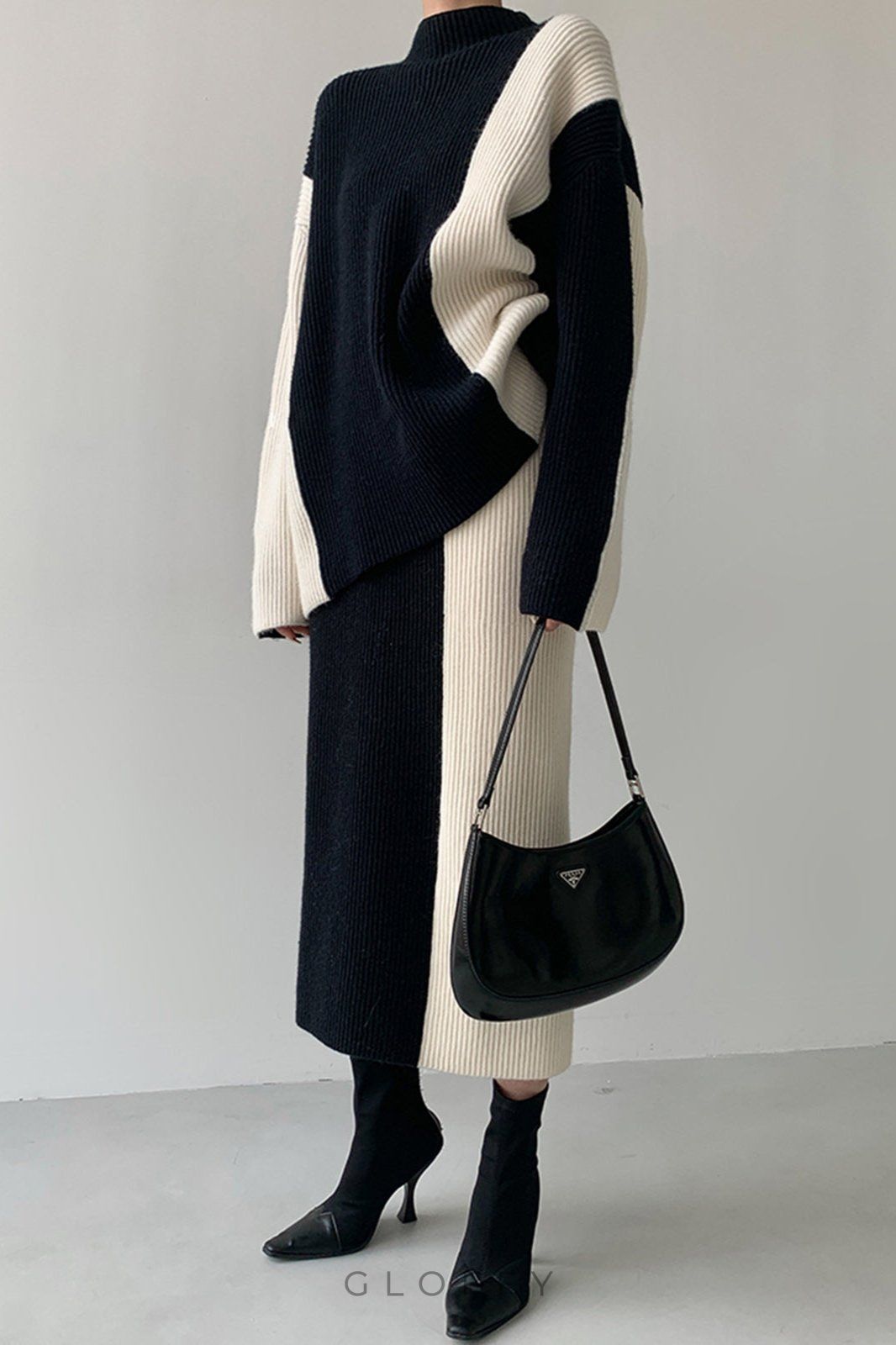Amara Monokrom Kontrast Bluz ve Etek Takımı