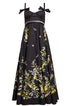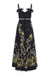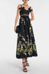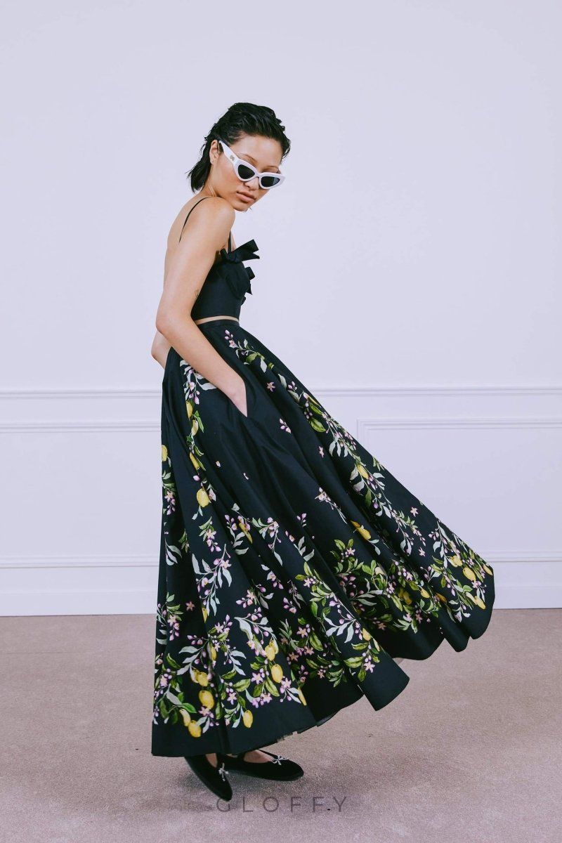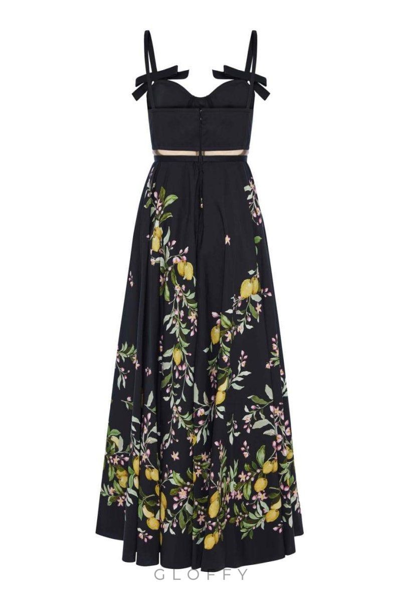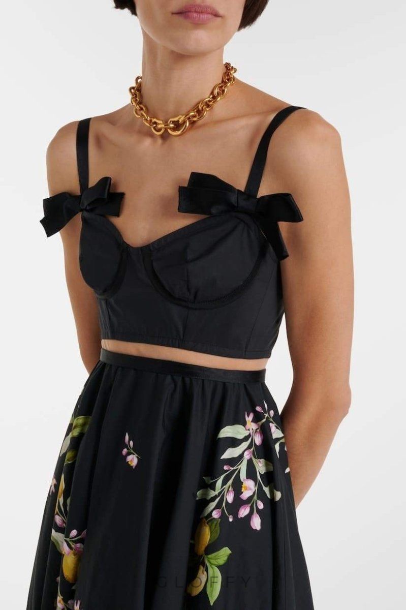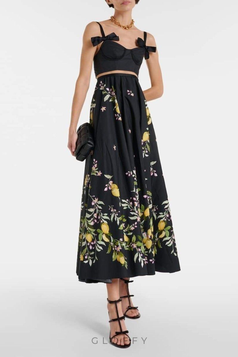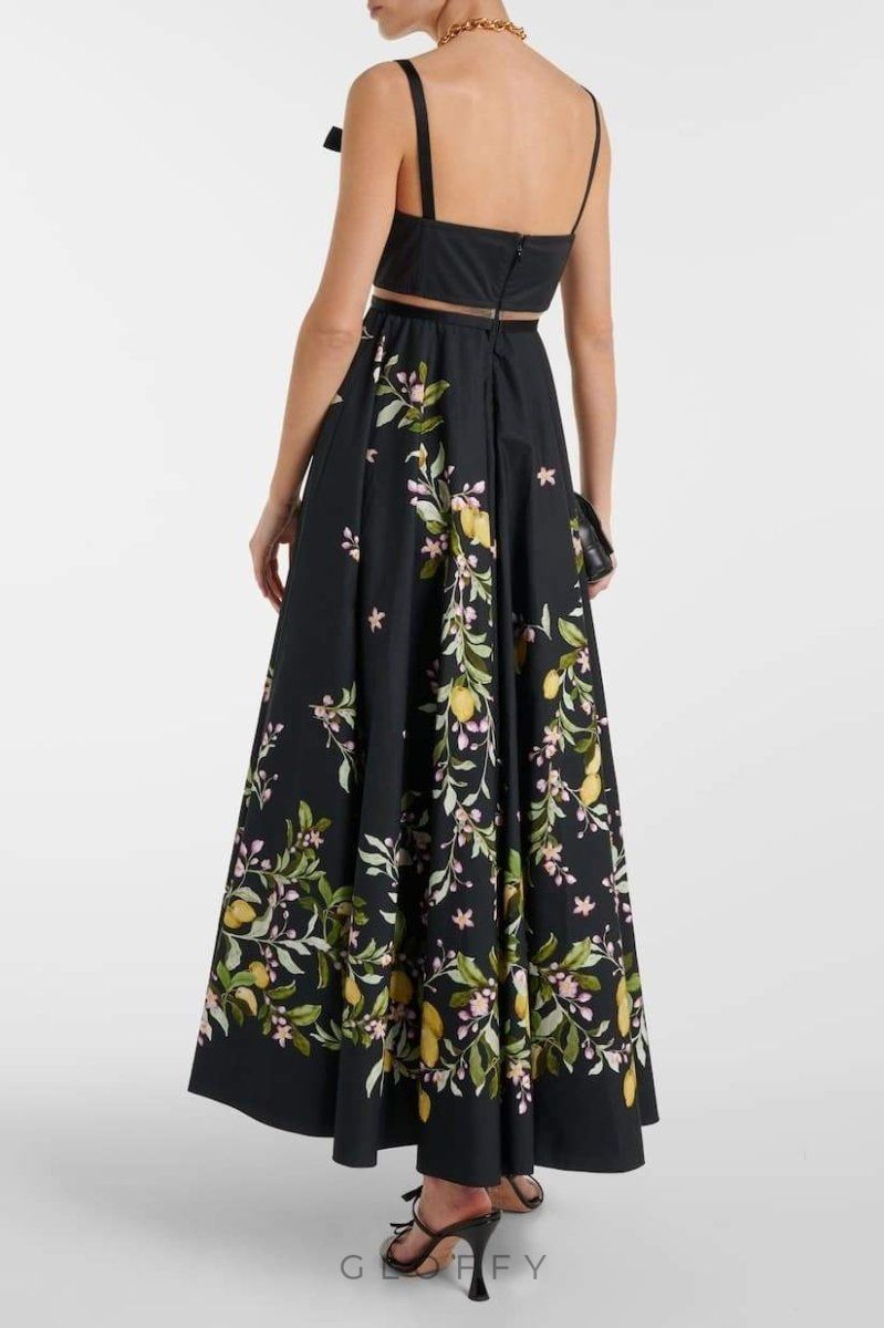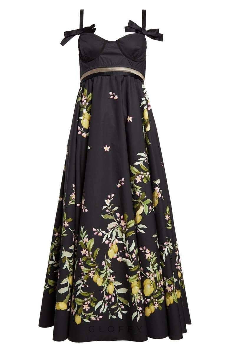 Bu bilek boyu elbise, zarif çiçek desenleri, kalp şeklinde yaka ve ince omuz askılarıyla büyüleyici bir stil sunuyor. Fiyonk detayları ve kloş etek, kadınsı siluetini vurgularken kolsuz tasarımı elbiseye hafiflik ve zarafet katıyor.