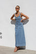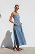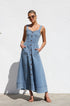 Gardırobunuzu bu şık orta mavi kot midi elbiseyle güncelleyin. Zamana meydan okuyan bir görünüm için ayarlanabilir kalın askılara ve göz alıcı kalp yakaya sahiptir. Ön kısımda uzanan suni düğme detayı klasik bir çekicilik katarken, ön cepler pratik işlevsellik sunar.