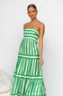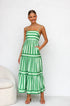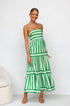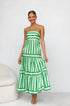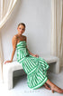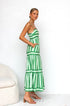 Yeşil çizgili tasarıma sahip Yeşil Laina Elbise ile gardırobunuzu zenginleştirin. Bu maksi elbise, ayarlanabilir spagetti askıları ve kişiye özel uyum için elastik büzgülü arka kısmıyla koyu ve açık yeşil çizgilerin çarpıcı kontrastını sergiliyor. Elbise göğüs çizgisinin altından zarif bir şekilde uzanarak zarif siluetini vurguluyor.