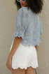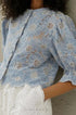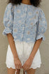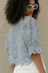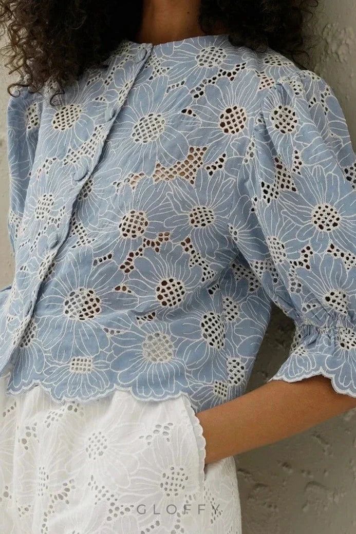Bu büyüleyici bluz, zarafet ve incelik yayan zarif mavi ve beyaz çiçekli dantel desenini sergiliyor. Kabarık kollar ve fistolu kenarlar vintage bir çekicilik katıyor, bu da onu hem gündelik geziler hem de özel günler için ideal kılıyor.