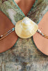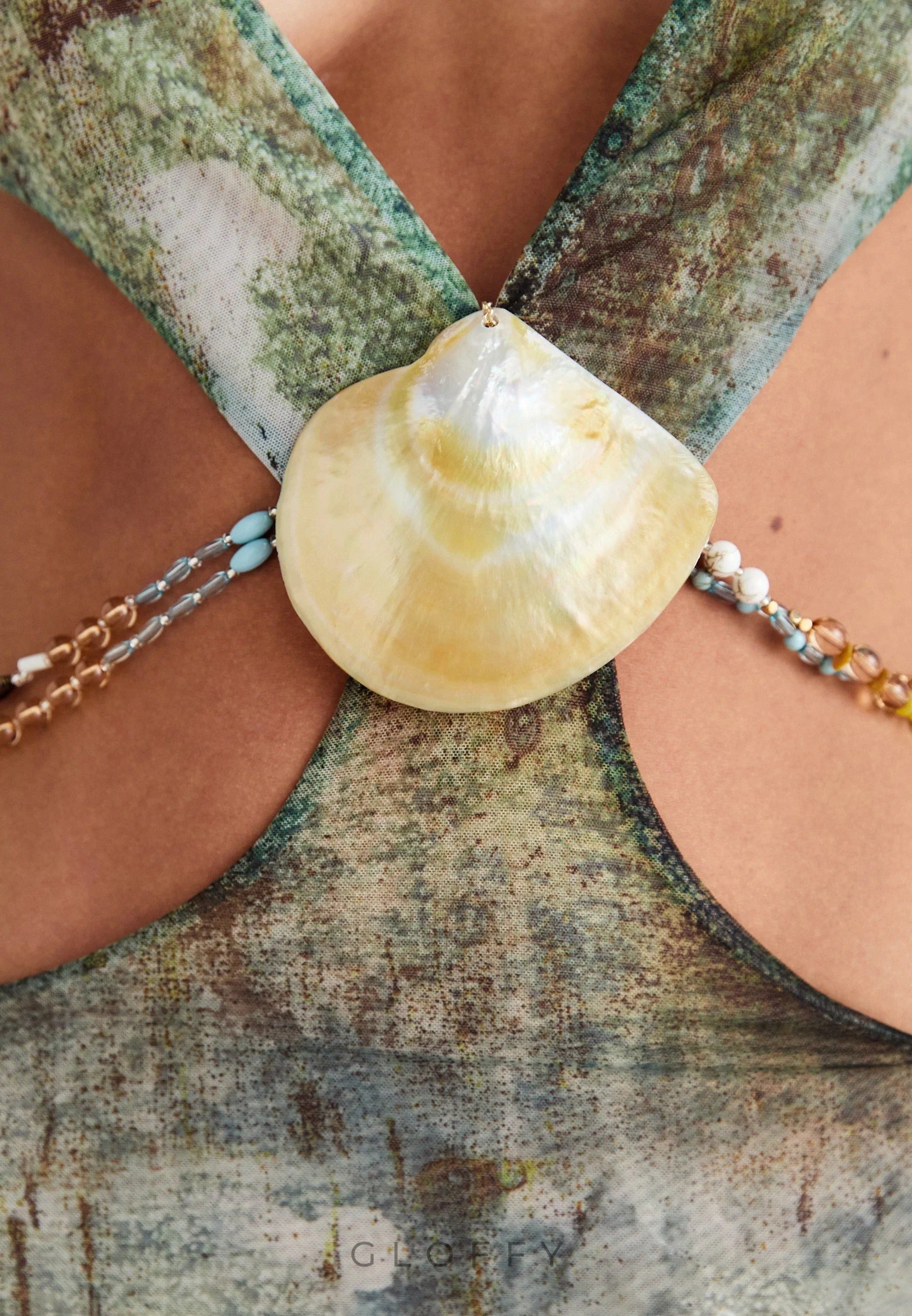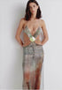Derin dekolteli ve düşük belli tasarıma sahip bu dramatik maksi elbiseyle kendinizi gösterin. Halter yaka tarzı zarafet katarken, çıkarılabilir gerçek deniz kabuğu süslemesi ve boncuklu kalça zincirleri kişiselleştirilebilir bir zarafet sunuyor.