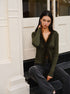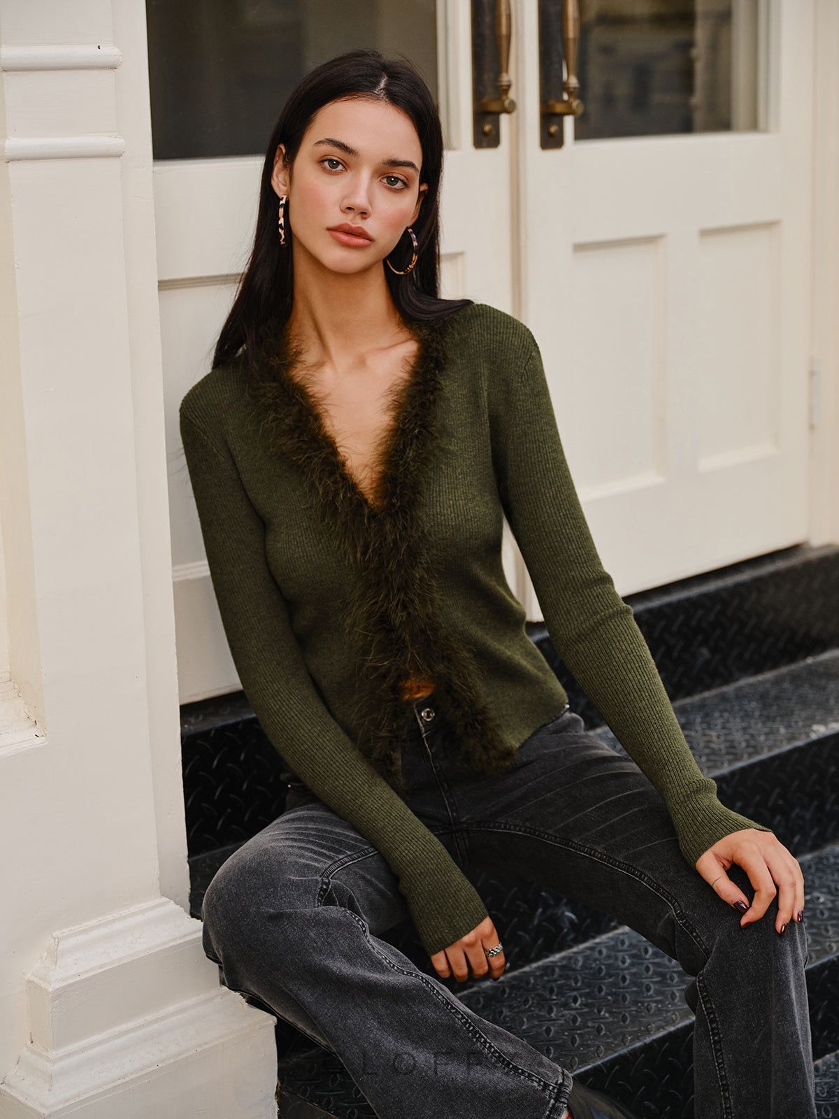 Tüy Detaylı V Yaka İnce Triko Hırka – Haki