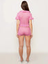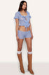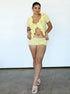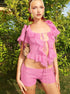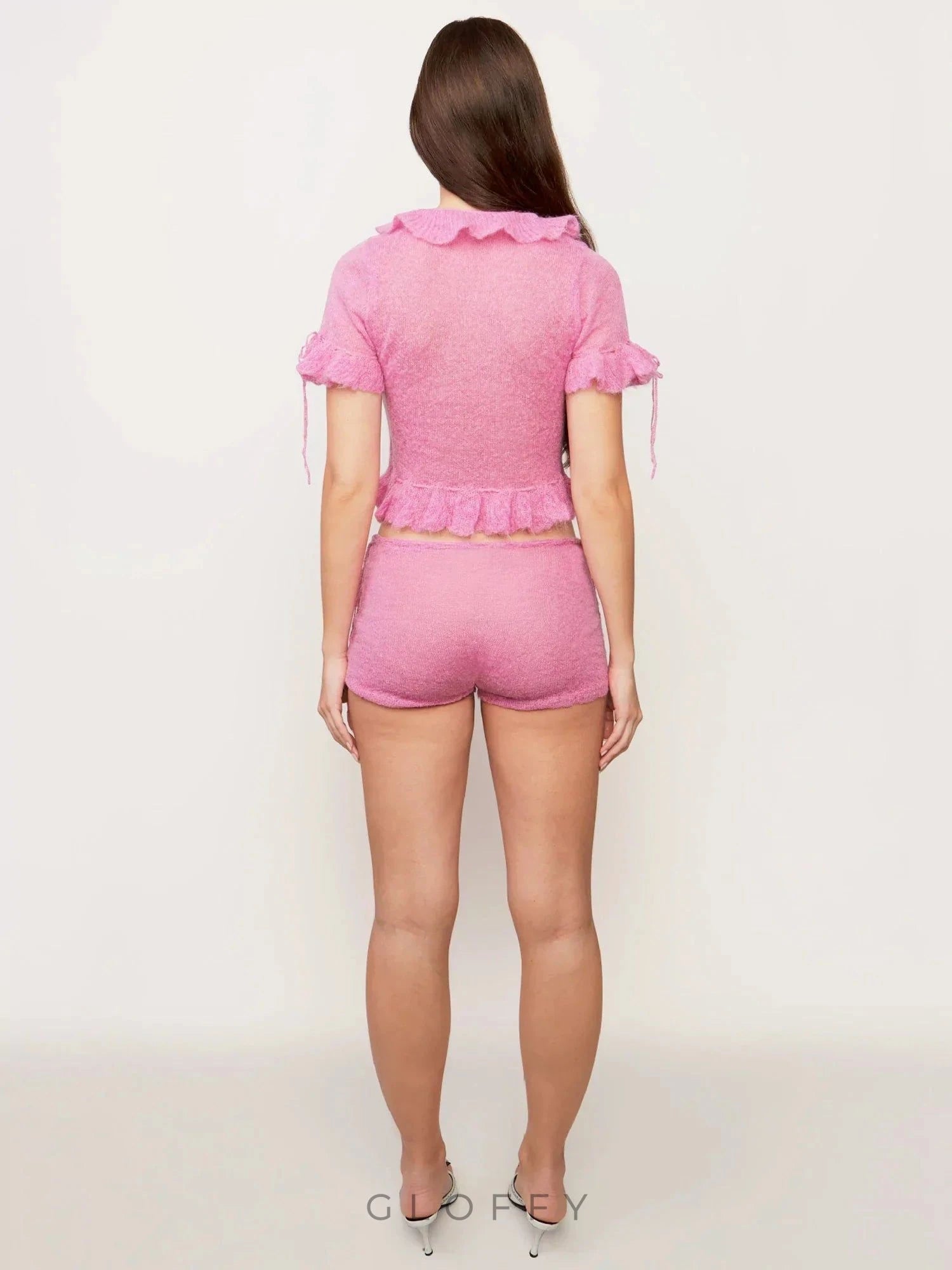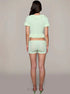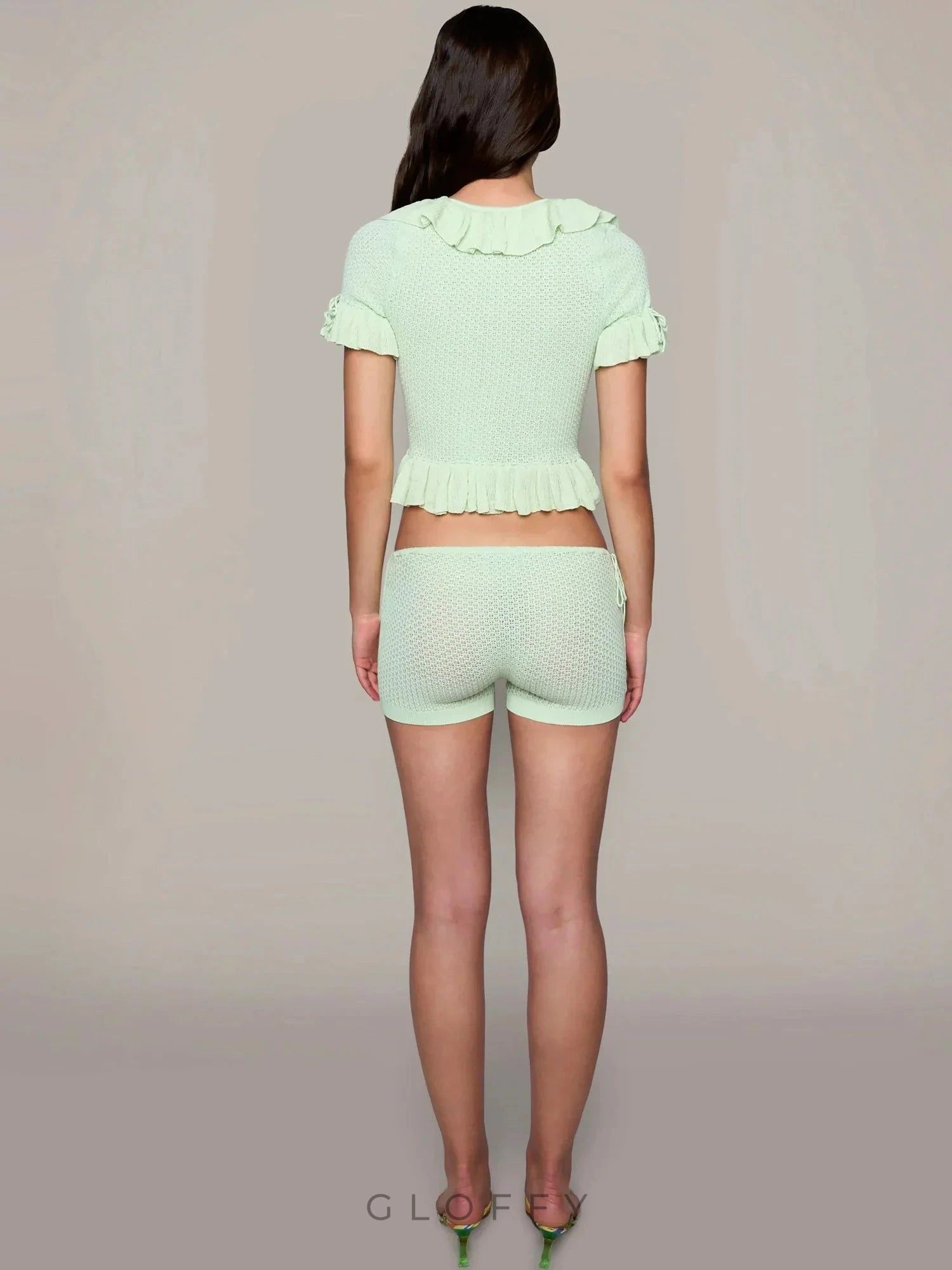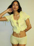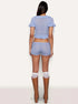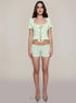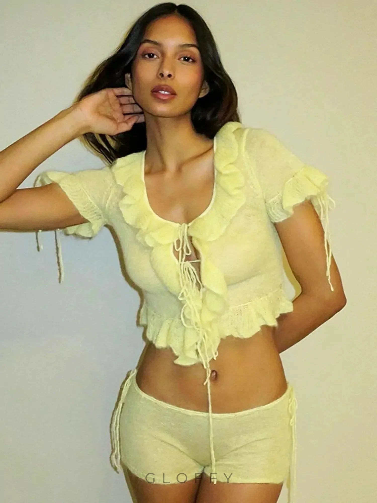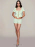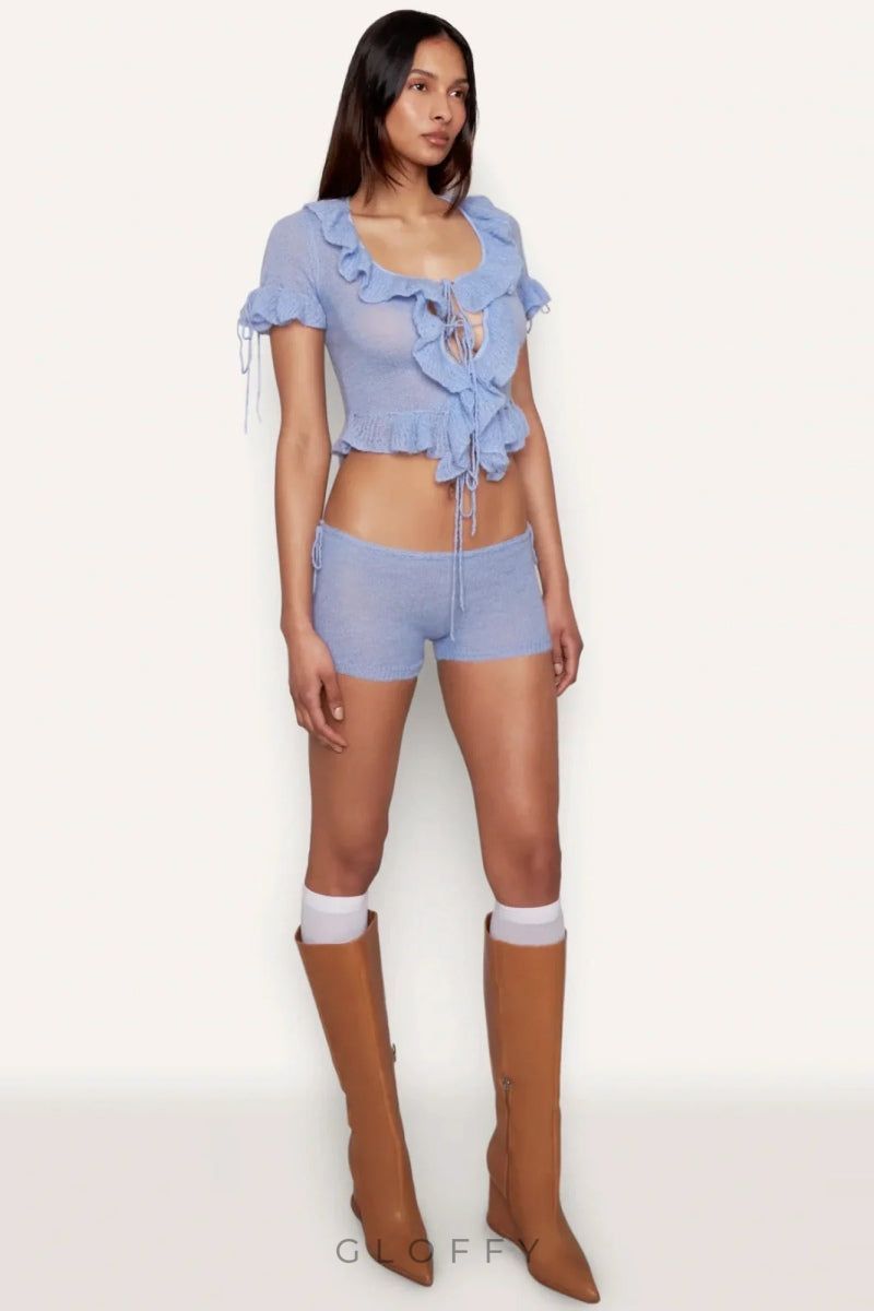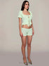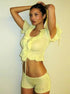 Zahmetsiz bir çekicilik yayan kolsuz, seksi bir kısa üst ve şort takımı. Bu saf renkli takım, zarif dantel detaylara ve bağlama tasarımına sahiptir ve kare yakalı, gurur verici, kısaltılmış bir silueti vurgulamaktadır. Kısa, bedene oturan şortlar üst kısmı tamamlayarak sezon için mükemmel, eğlenceli ama sofistike bir görünüm yaratıyor.