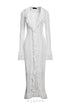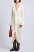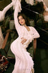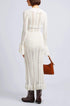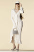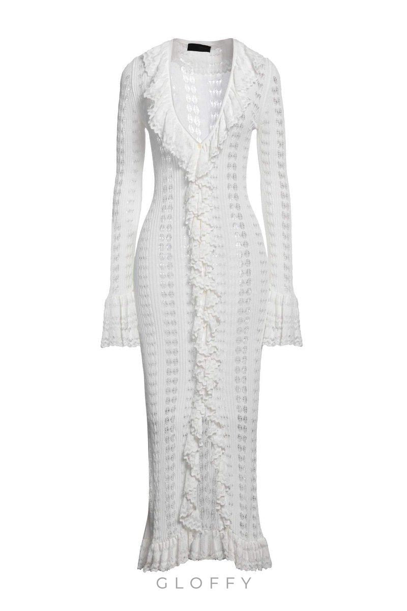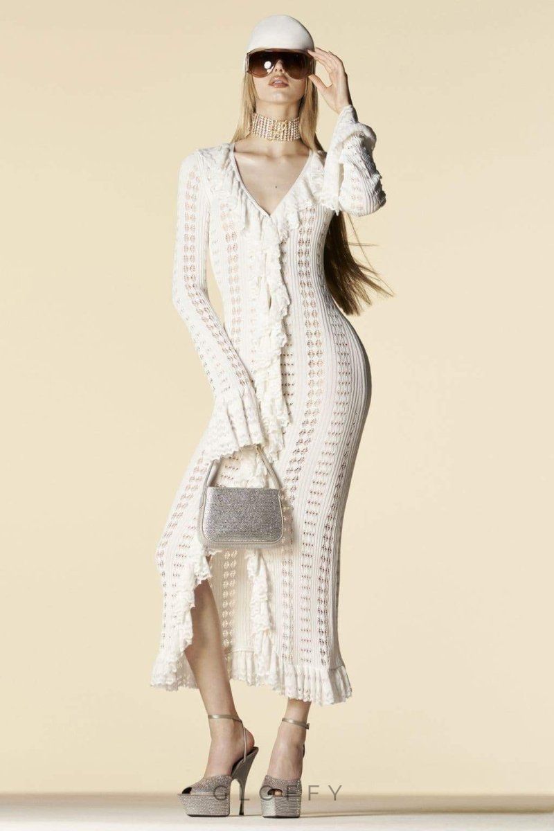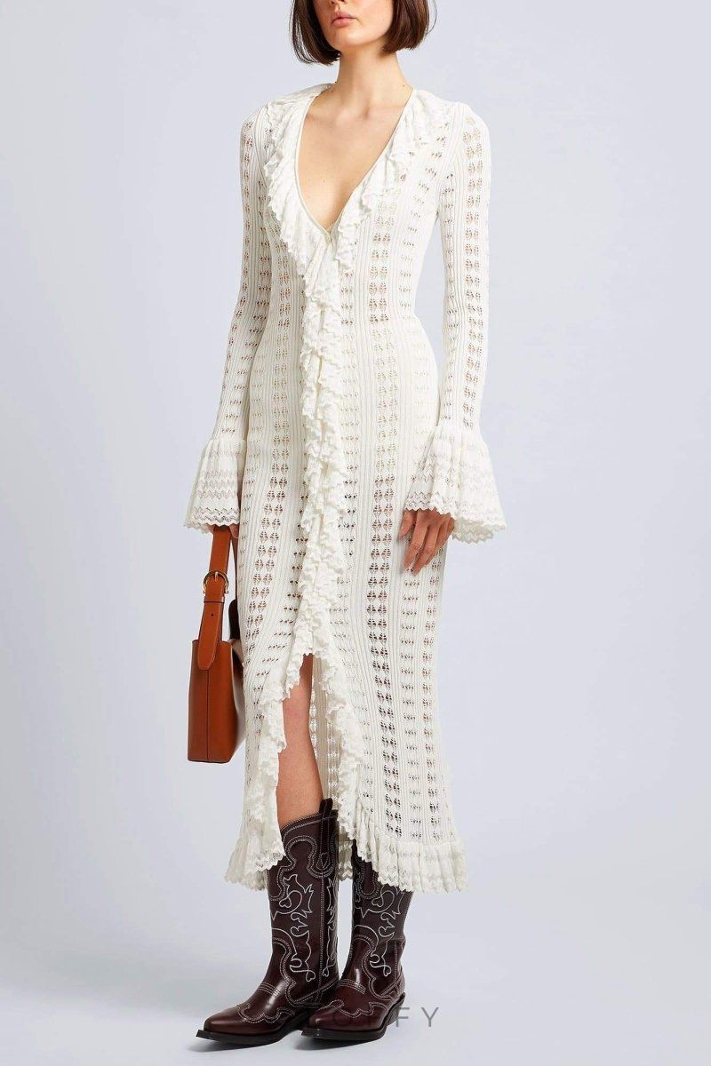 Göz alıcı V yakalı ve uzun çan kollu, Fırfırlı V Yaka Midi Elbisemizle şıklığı kucaklayın. Fırfırlı süslemeler ve lale etek kısmı sofistike bir dokunuş katarken, çok esnek triko rahat, vücuda oturan bir siluet sağlar.