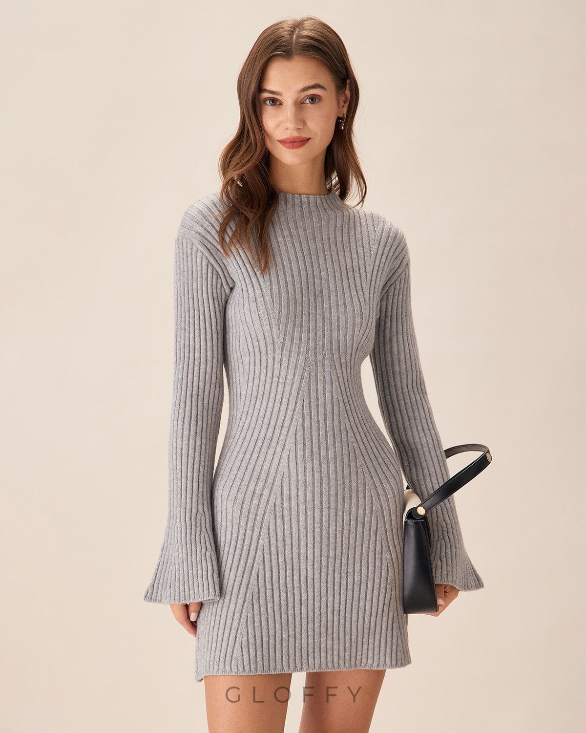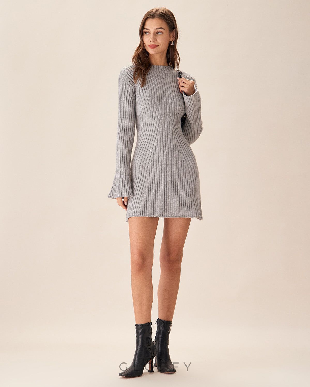 Mira Gri Bisiklet Yaka Çan Kollu Triko Elbise