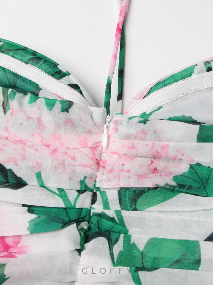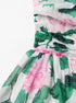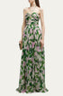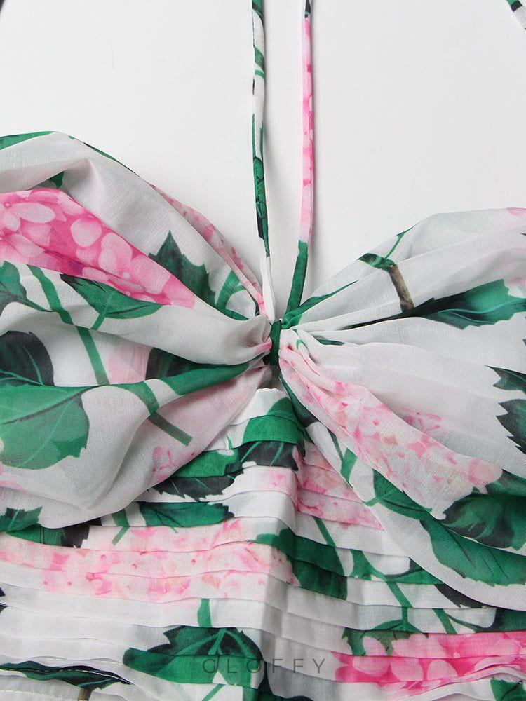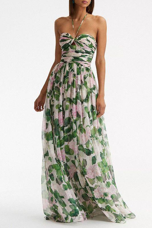 - Tasarım: Yeşil çiçek desenli boyundan bağlamalı uzun elbise