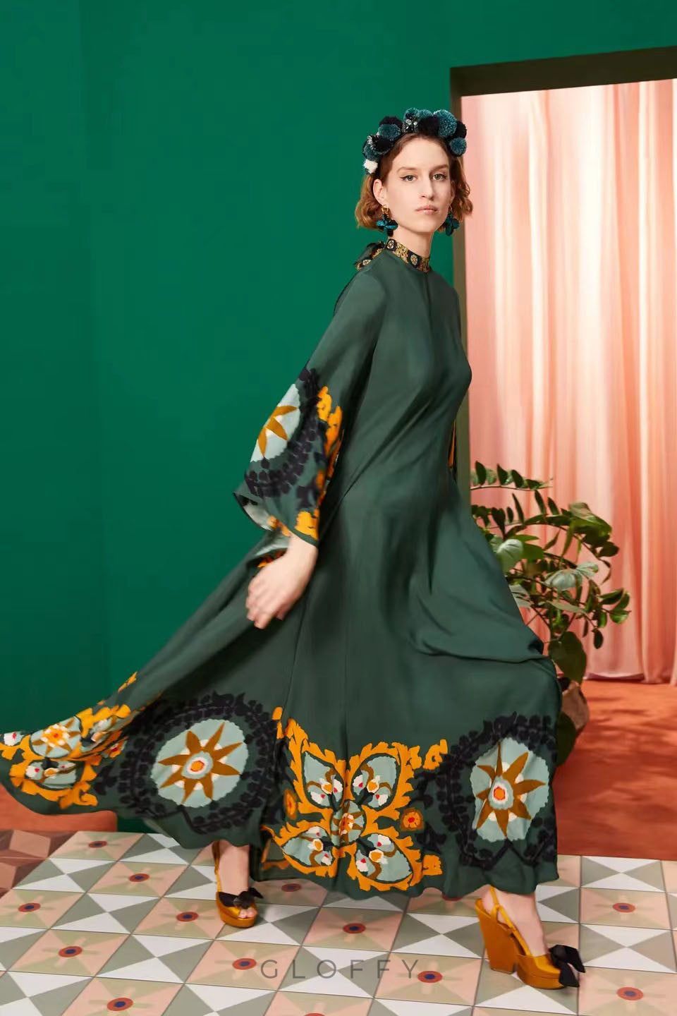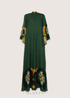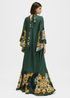 Bu çarpıcı elbise, etkileyici pelerin kolları ve parlak baskısıyla özel günler için mükemmel bir seçimdir. Dik yaka ve kendinden kravat detaylı arkası açık tasarım şıklık katarken, dar bel ve ters ön pili silueti güçlendiriyor. Viskondan üretilen, zemini süpüren eteği zahmetsizce akarak her adımda zarafet yayar.