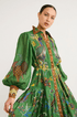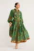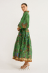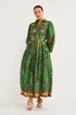 • Tasarım: Baskılı tasarımlı, geniş kenarlı, devrik yakalı ve beli bedene oturan fener kollu elbise