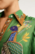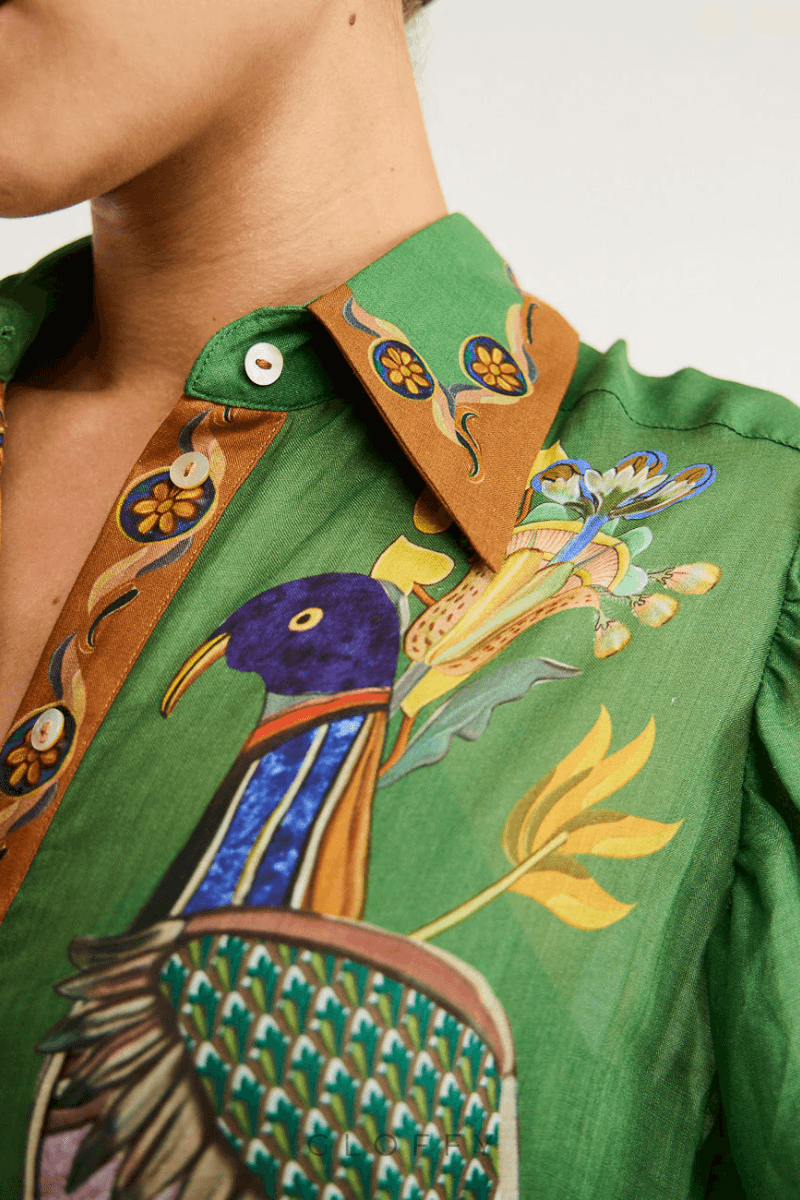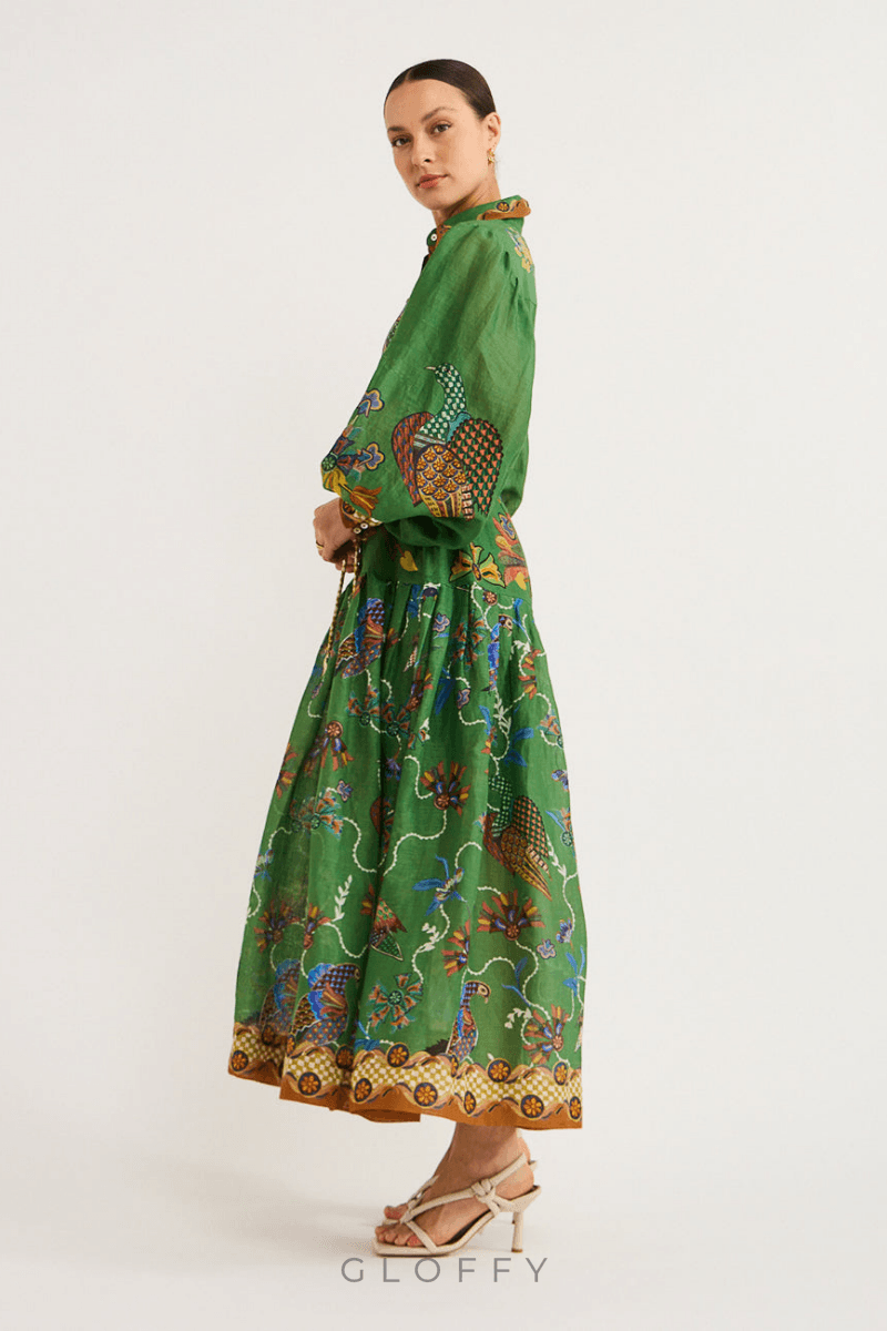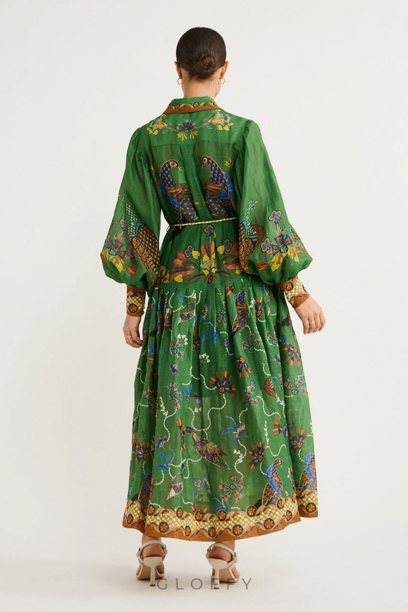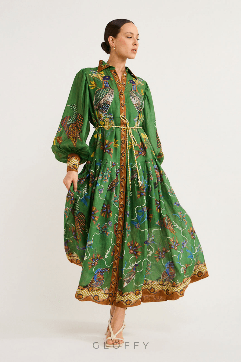 Bu zarif elbise, tasarıma sofistike bir dokunuş katan hacimli fener kollu ve klasik yakalı bir yakaya sahiptir. Dar bel, hoş bir siluet yaratırken, akıcı, geniş etek ona zarif, dramatik bir hava katıyor. Canlı baskı, elbisenin cesur ama zarif görünümünü güçlendirerek onu çeşitli durumlar için mükemmel kılar.