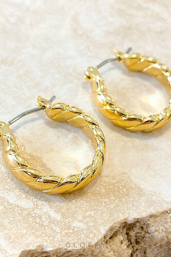 Pirinç ana metal üzerine 18K altın kaplamaya sahip bu bükümlü halka küpelerle zarif bir dokunuş katın. Tasarım, uzun süreli parlaklık ve dayanıklılık sağlamak için kararmaya karşı koruyucu bir katmanla kaplanmıştır.