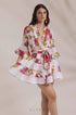 Bu mini elbise, tamamı büyüleyici çiçek desenli V yakalı, zarif dantel süslemeli ve eğlenceli fırfırlı. Hafifçe esnek polyesterden yapılmış olup, hoş bir uyum ve zarif bir hareket sunar.
