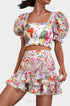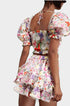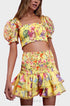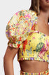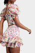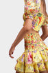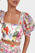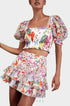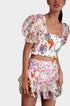 Bu çarpıcı parça, geometrik güpürlerle süslenmiş asimetrik fırfırlara ve elle boyanmış baskı elemanlarına sahip olup benzersiz ve göz alıcı bir tasarım yaratıyor. Kare yaka ve kısa kabarık kollar vintage bir çekicilik katıyor, büzgülü panel ve büzgülü detaylar ise yüksek esnekliğe sahip hoş bir uyum sağlıyor.
