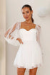 Yapılı bir uyum için göğüs üzerinde dikili dolgulu kuplar bulunan mini boy elbisemizle tarzınızı yükseltin. Korse tarzı detaylar vintage bir çekicilik katarken, elastik manşetli tül balon kolları ilginç ve romantik bir hava katıyor.