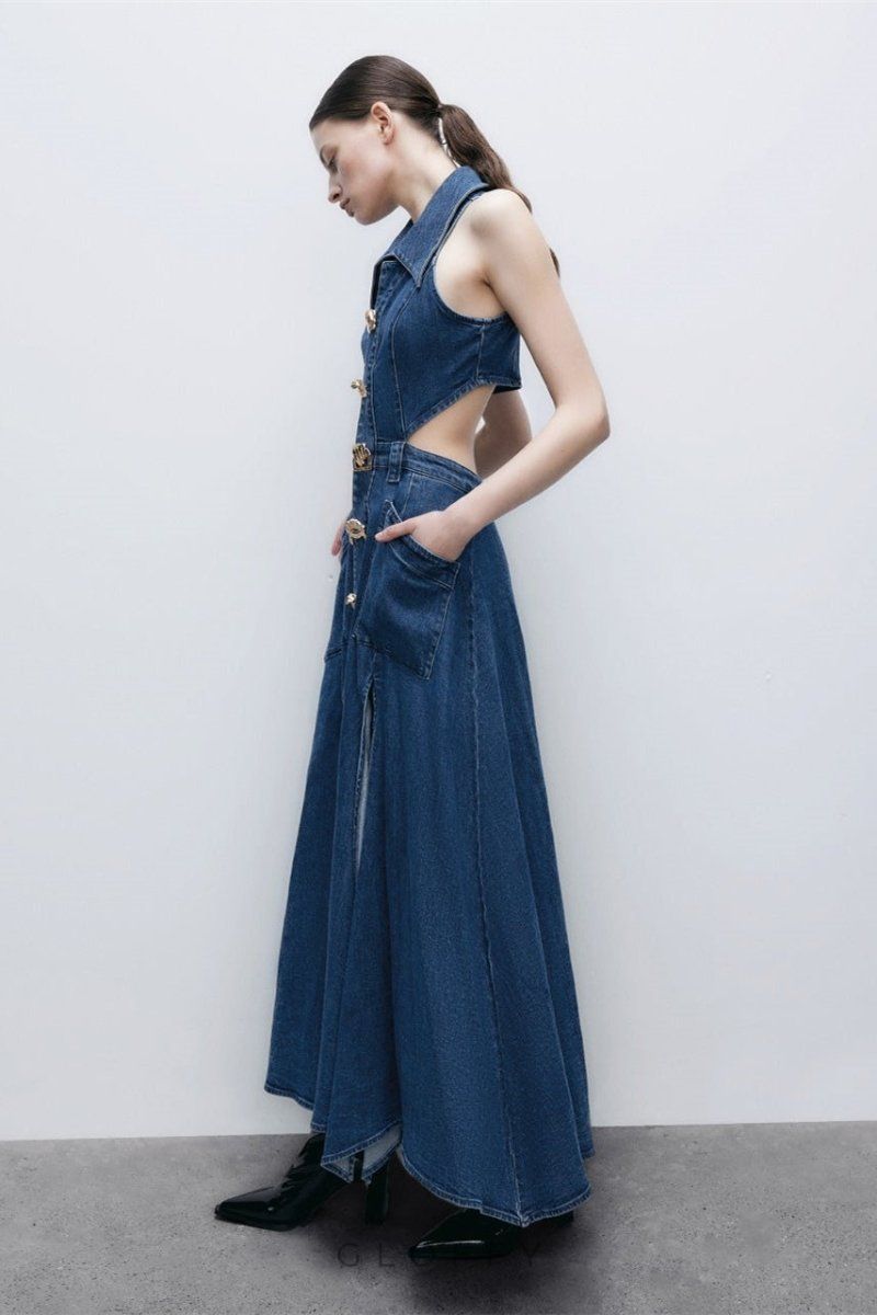 Kolsuz Denim Mini Elbisemizle cesur bir moda ifadesi yaratın. Çarpıcı metal tokalara ve oyuk tasarıma sahip bu elbise, sıra dışı stili klasik denimle birleştiriyor. Yaka yakası, mini uzunluktaki siluete sofistike bir dokunuş katıyor.