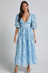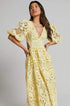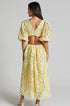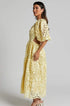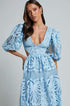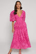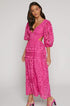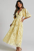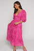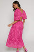 Bu midi elbise V yakalı, 3/4 kollu ve zarif A kesimli bir siluete sahiptir. Kesik ayrıntılar ve karmaşık dantel işlemeler, sofistike ve çekici bir dokunuş katıyor.