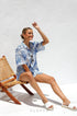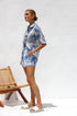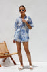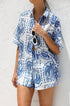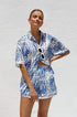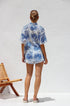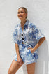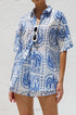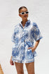Beyaz zemin üzerine mavi baskıya sahip bu şık iki parçalı setle gardırobunuzu güncelleyin. Set, şık ve gündelik bir görünüm sunan, kutu gibi bir silüet ve hafif yuvarlak alt kenarlı, rahat kesimli, yakalı, düğmeli bir gömlek içerir. Üst kısım astarsız ve şeffaftır, katmanlama için mükemmeldir.