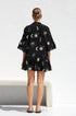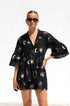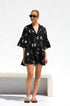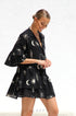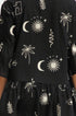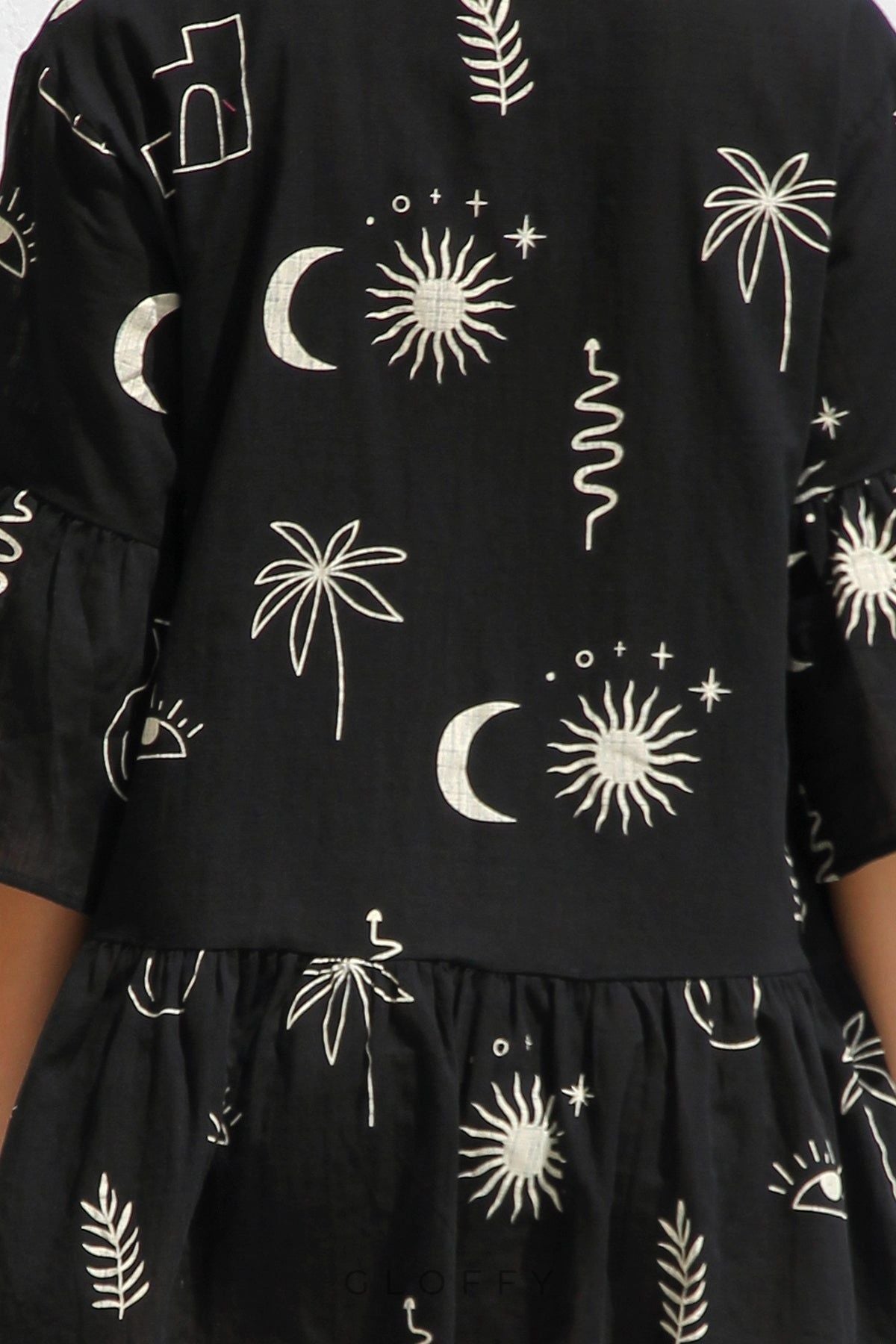 Bol kesimli ve siyah zemin üzerine sofistike bej baskıya sahip bu önlük tarzı elbiseyle zahmetsiz zarafeti deneyimleyin. Hafif bir parıltıya sahip orta uzunlukta kollar zarif bir dokunuş katarken, işlevsel düğmeli ön kısım çok yönlü stil seçenekleri sunar.