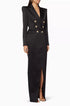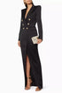 V yakalı ve altın düğmelerle süslenmiş kruvaze tasarımıyla sofistike bir görünüm sunan bu zarif elbise, şıklığınızı ön plana çıkarıyor. Sivri yaka ve destekli omuz detayları zarif tarzınızı güçlendirirken, yüksek yırtmaç modern bir çekicilik katıyor.