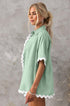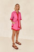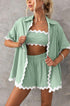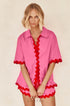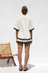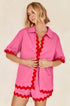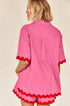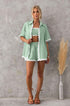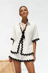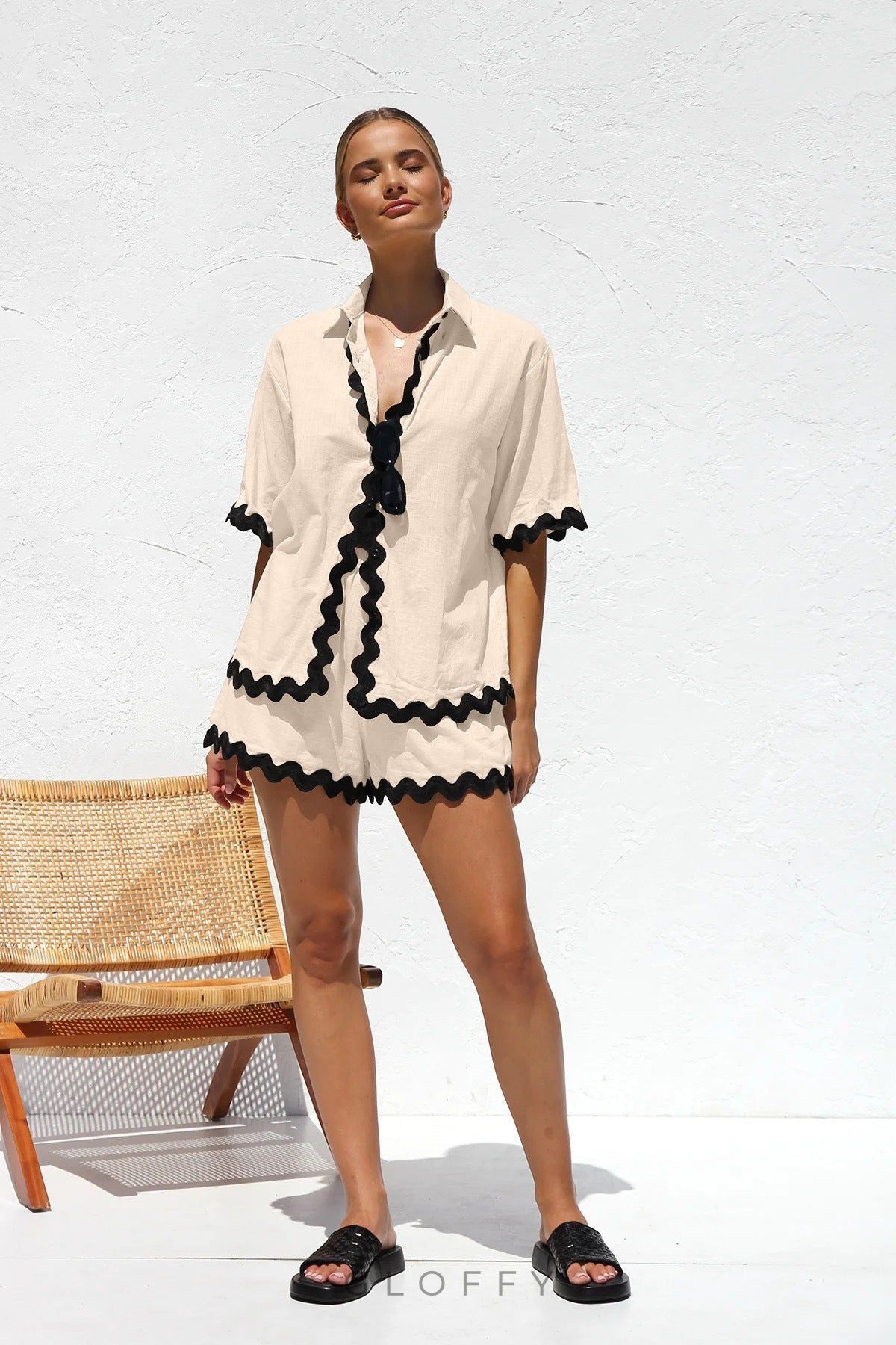 Düz gömlek bluz ve kontrast yama işi ile yüksek bel geniş bacak şortundan oluşan düz monoton setimiz kesinlikle dikkat çekicidir. Yaz setleri tüm yıl boyunca en çok satan saatlerdir. Günlük bir etkinlik olan bu geceki buluşmada baskılı desenli yaka ve kollar, genel görünümün estetiğine sadece bir dokunuş katıyor.
