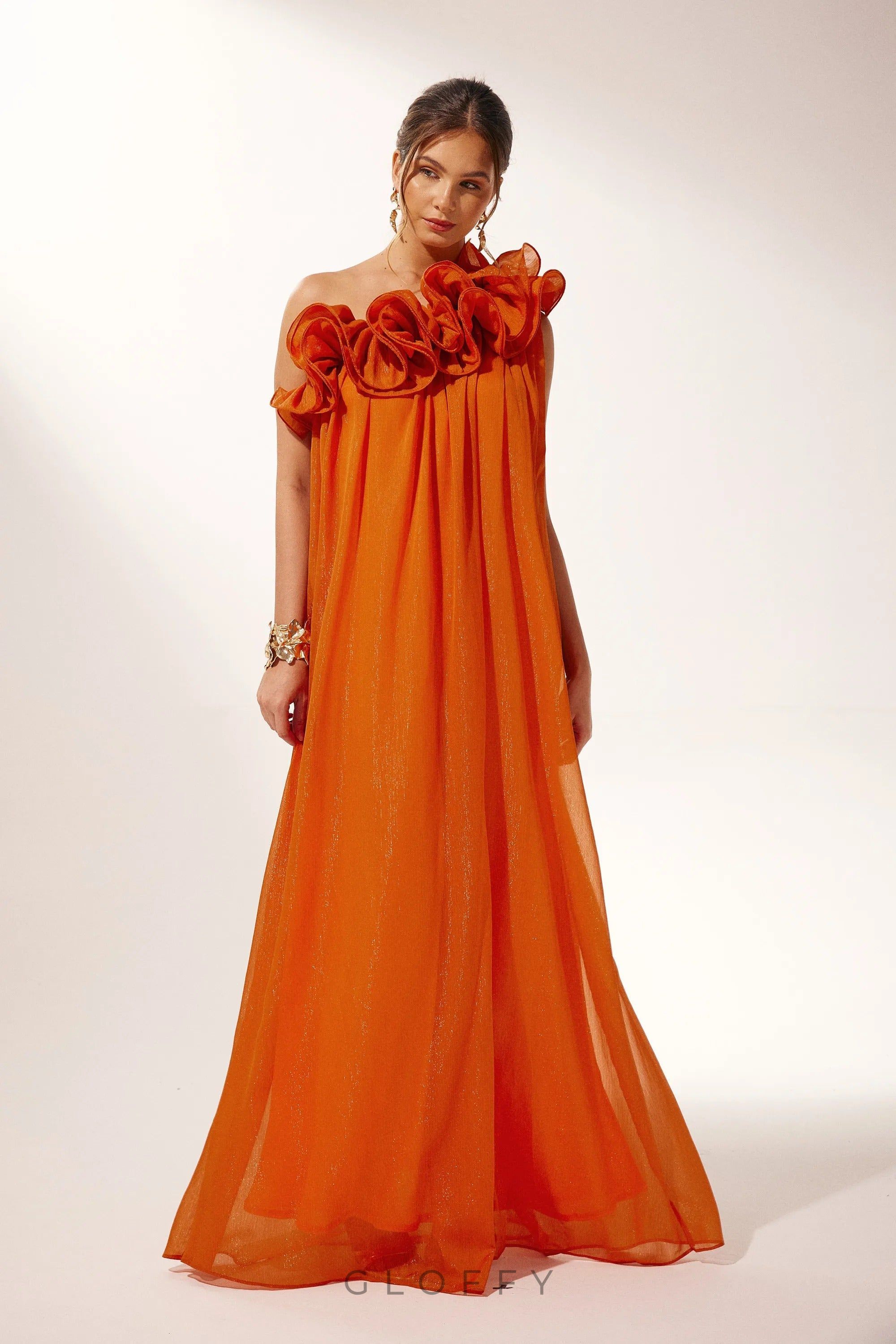 İkonik tasarım anlayışını yansıtan Solmira, tek omuzdan yükselen hacimli çiçek detayları ve dökümlü siluetiyle sahnede tüm bakışları üzerinize çeker. Hem zarif hem iddialı duruşuyla özel davetlerde unutulmaz bir etki bırakır.