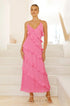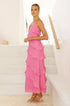 Omuzlarınızı zarif bir şekilde çerçeveleyen şık boyundan bağlamalı tasarıma sahip, nefes kesen maksimum uzunlukta elbisemizle tarzınızı yükseltin. Askıları altın boncuklarla süslenen bu elbise, her duruma uygun, gösterişli bir dokunuş katıyor.