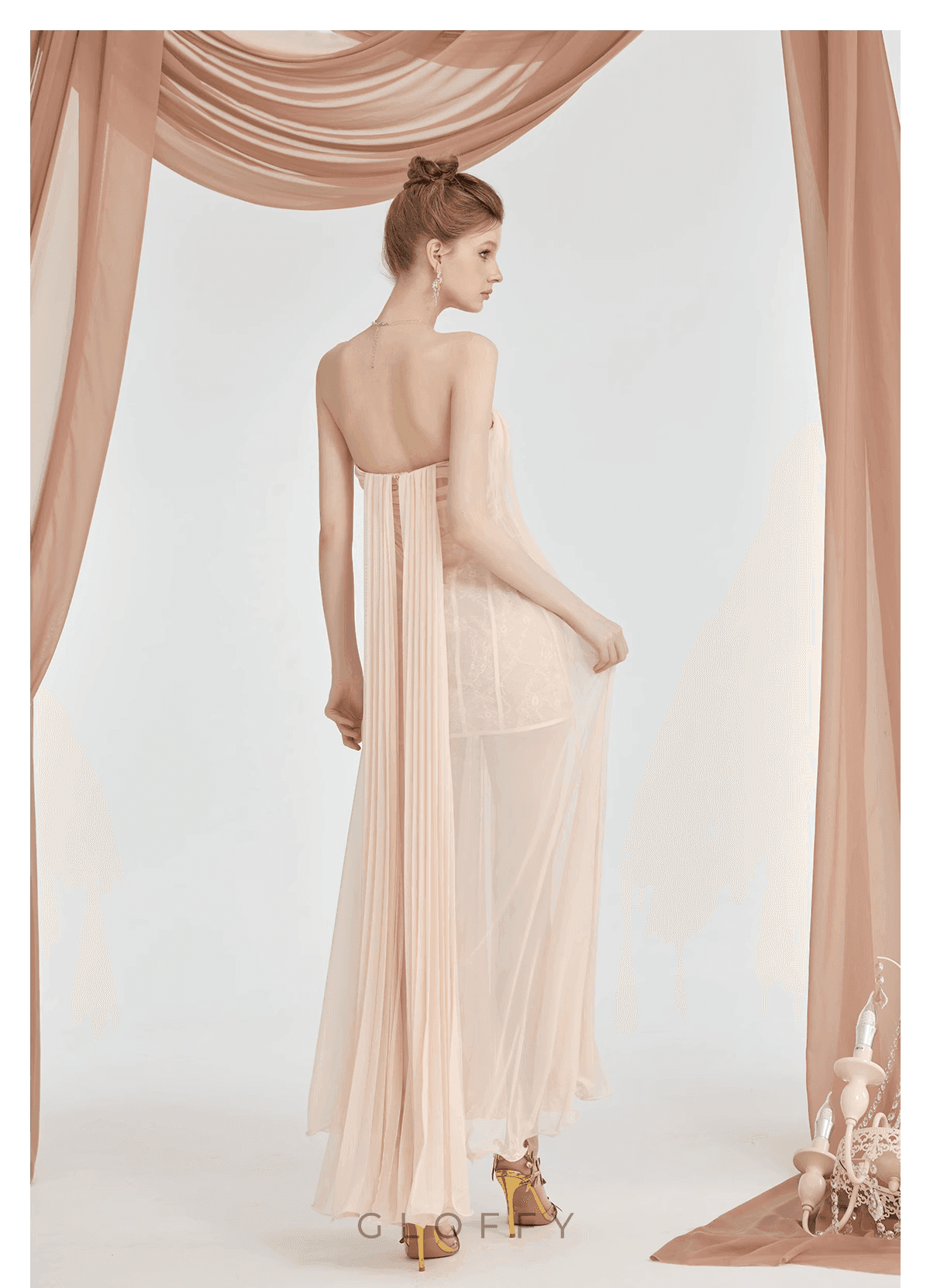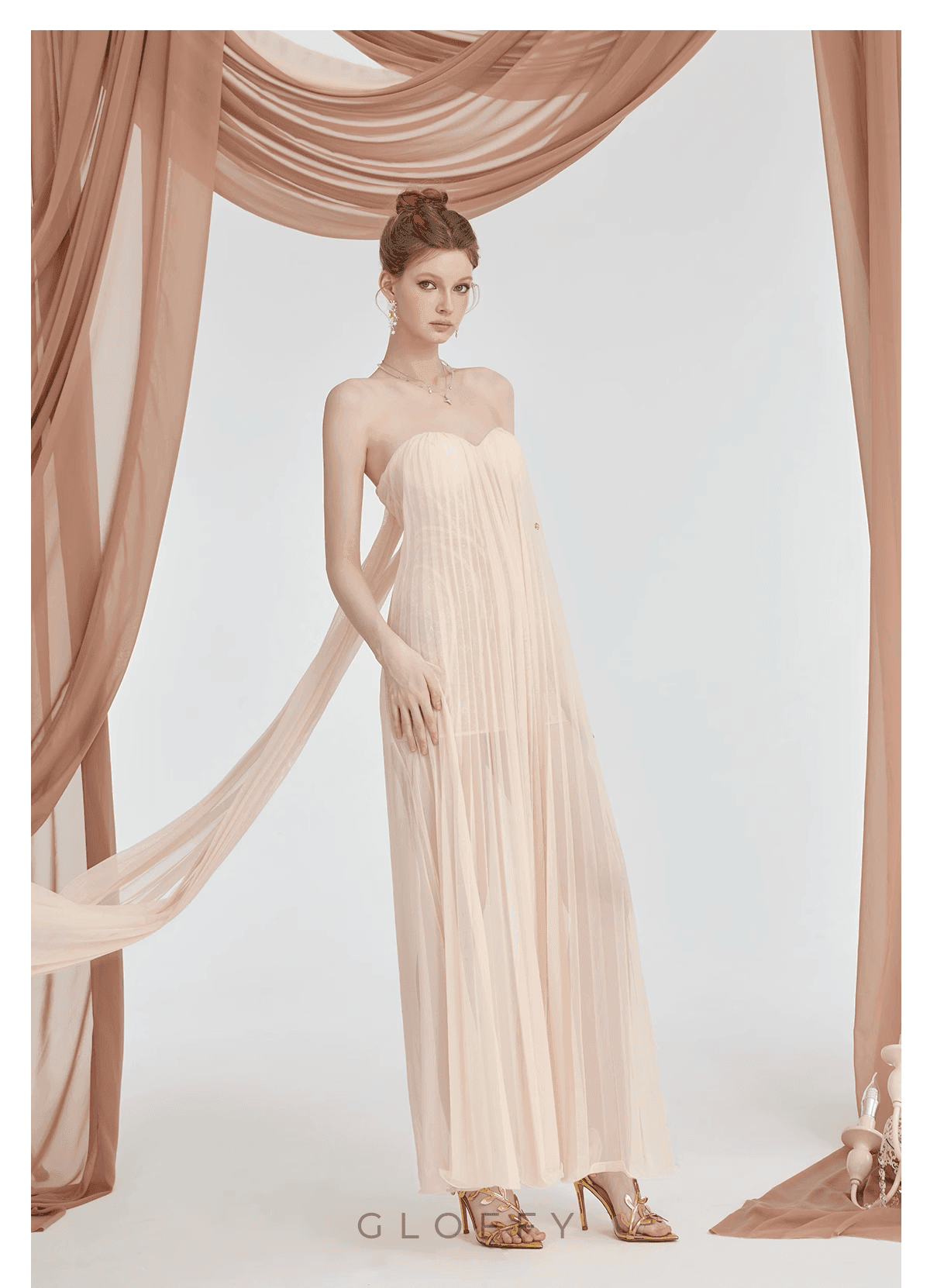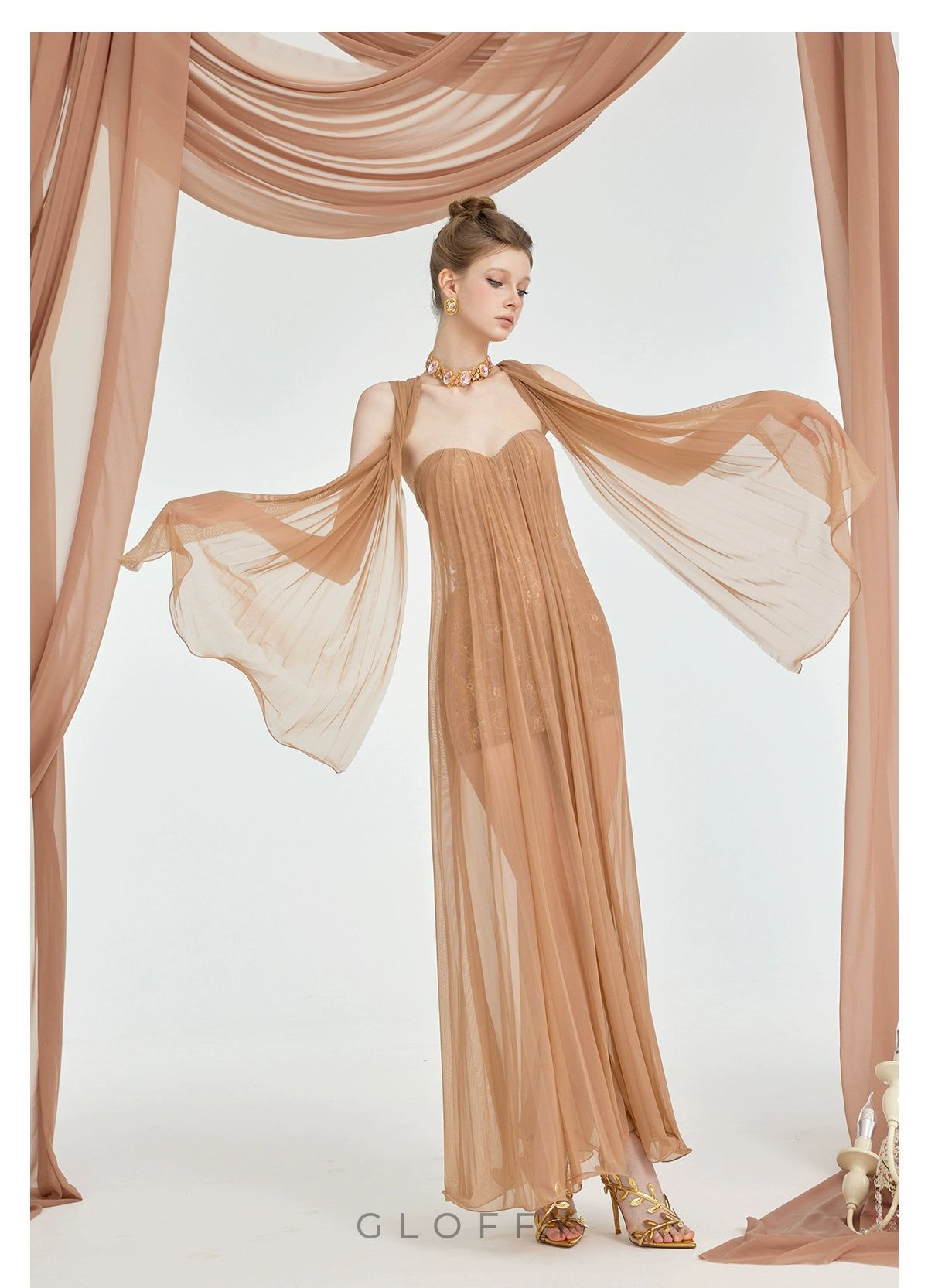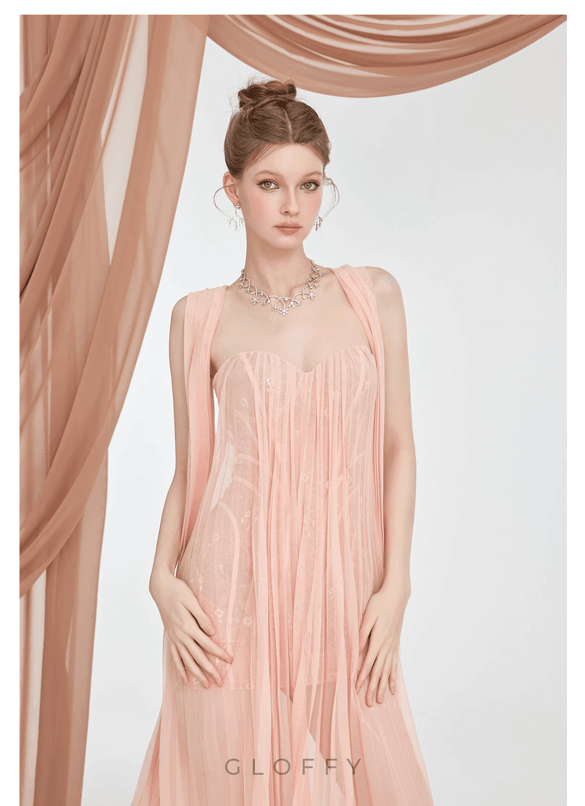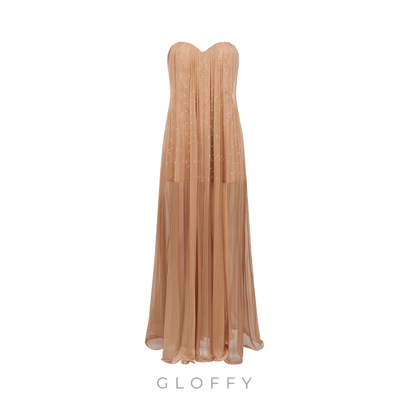Zarif silüeti ve akışkan tül kumaşı ile büyüleyici bir görünüm sunar. Kalp yaka tasarımı ve hafif drapeli korsajı, vücuda mükemmel bir uyum sağlar. Uzun, yere kadar uzanan etek kısmı hareket ettikçe akışkan bir etki yaratarak sofistike bir duruş kazandırır.