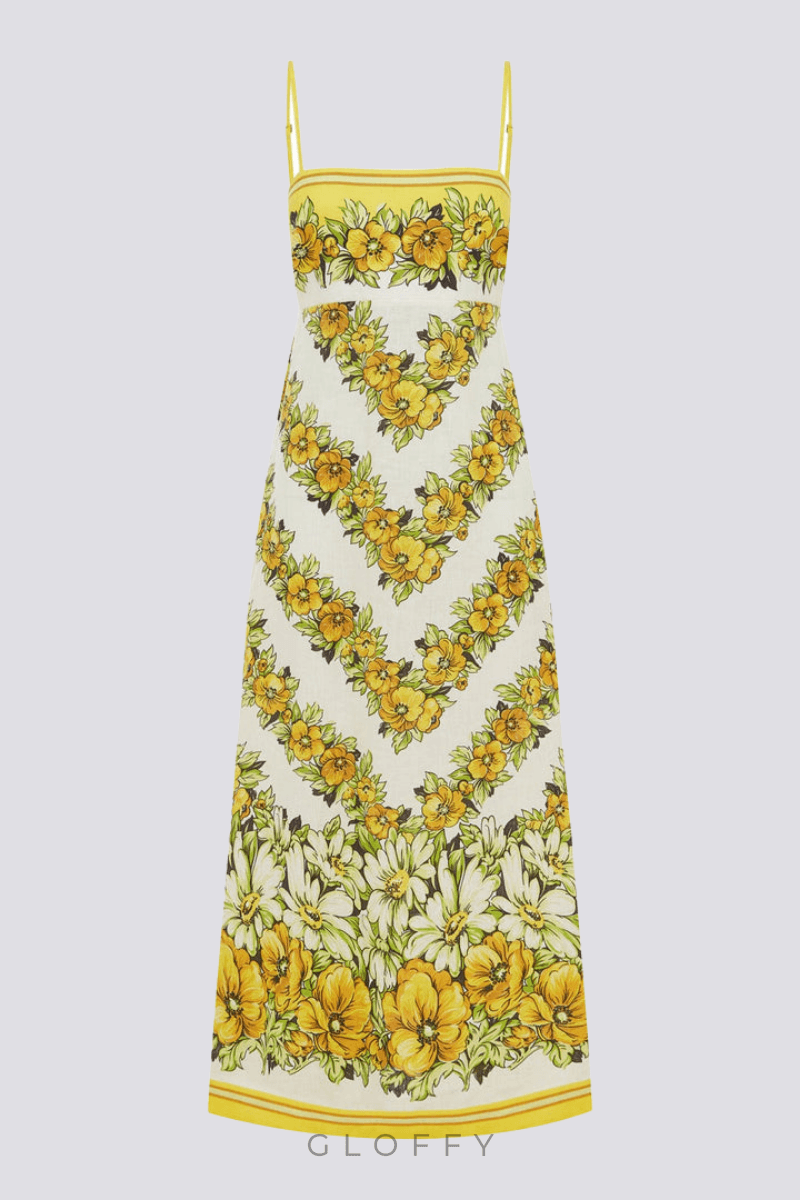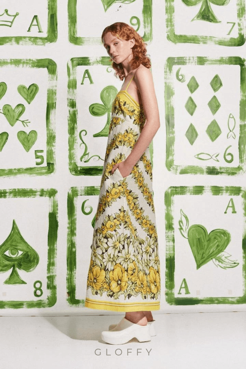 - Tasarım: Bitki temalı baskılı, ince askılı, yüksek belli elbise