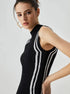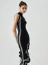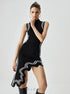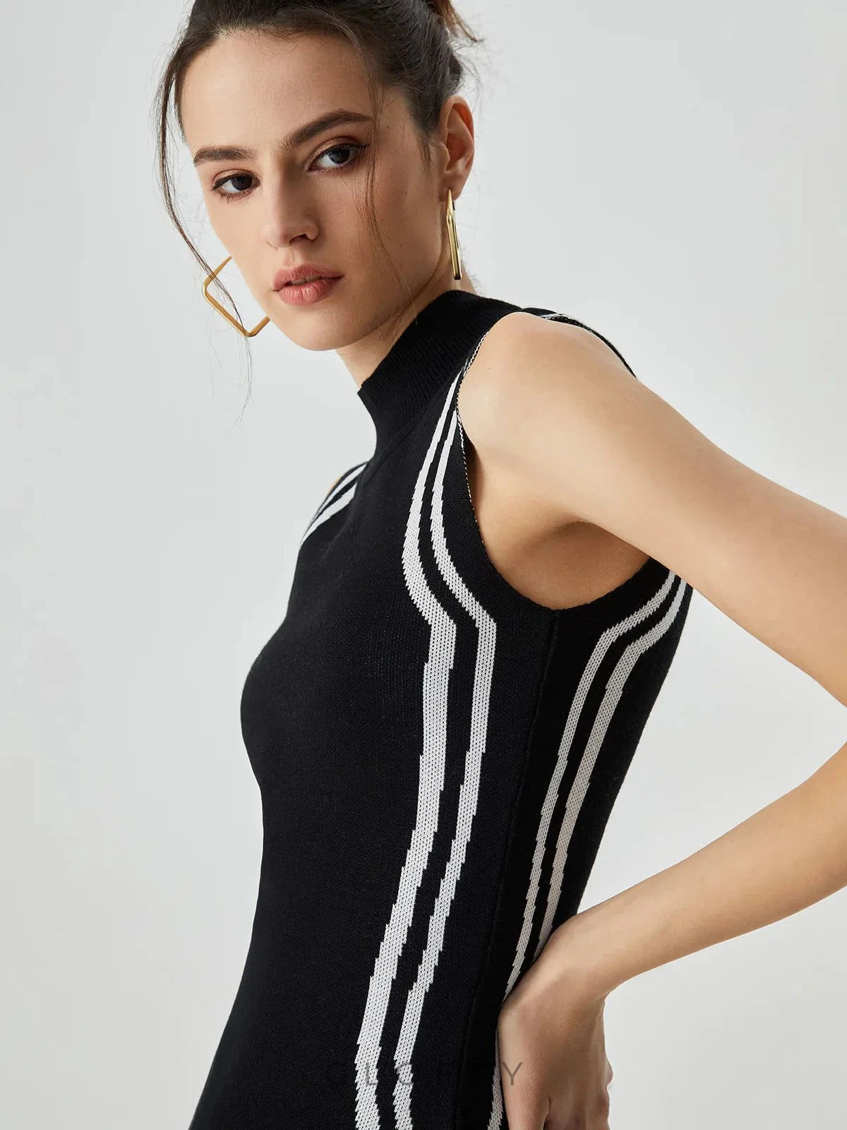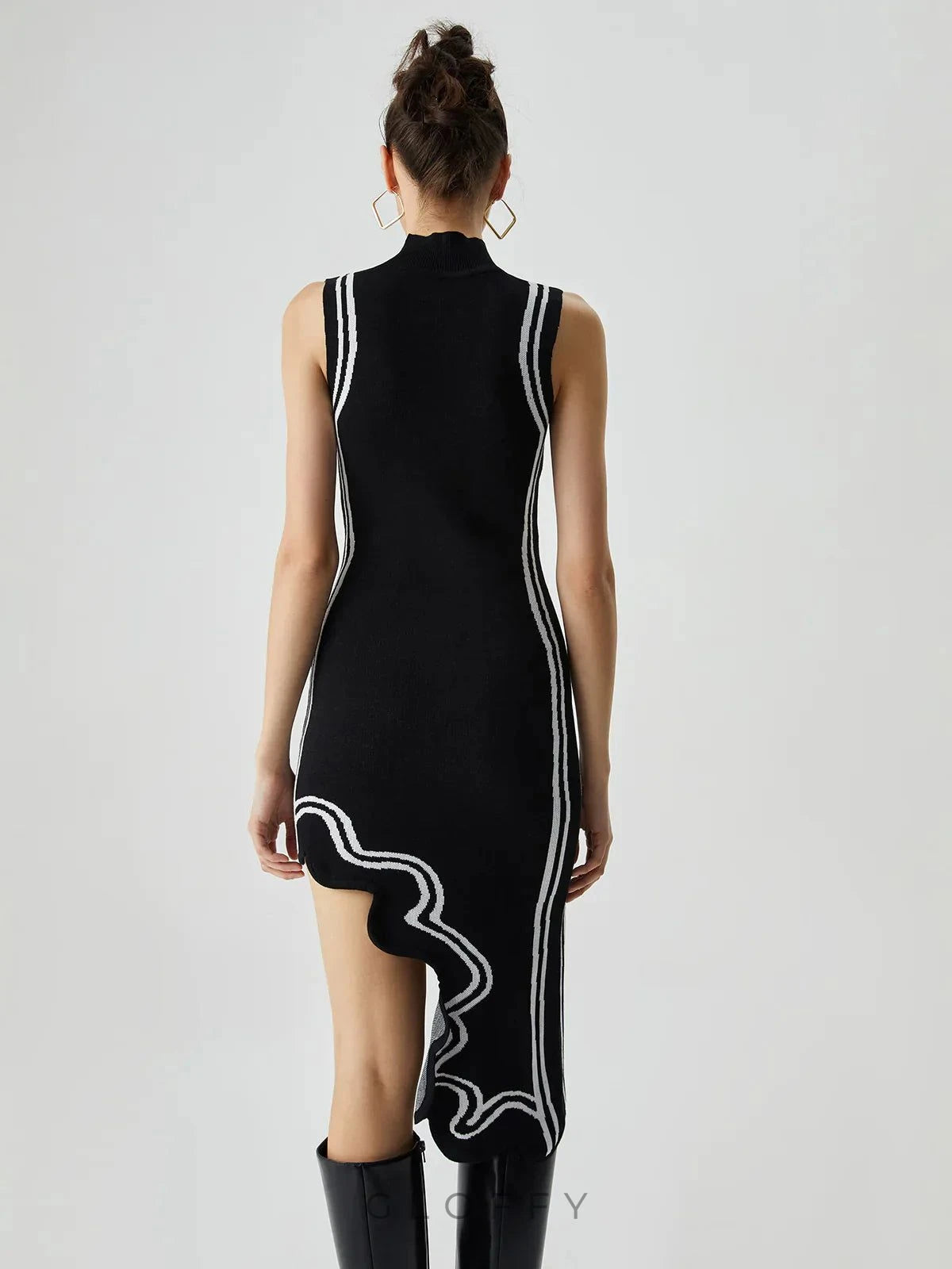 Modern çizgileri ve dikkat çekici detaylarıyla bu asimetrik midi elbise, tarzınızı öne çıkarmak için mükemmel bir seçimdir. Vücuda oturan kesimi ve kontrast dikiş detayları, dinamik ve zarif bir görünüm sunar. Yüksek balıkçı yakası sofistike bir hava katarken, dalgalı yırtmaç detayı hareketli bir siluet oluşturur.