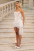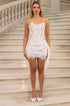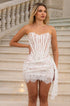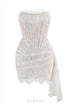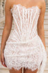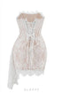 Düşük omuz stili ve düzensiz dantel vurgularıyla korse tasarımına sahip bu askısız mini elbiseyle kendinizi gösterin. Dantel ve fileden üretilen bu ürün, sofistike, esnemeyen bir kesimle vücuda oturan bir silüet sunuyor.