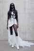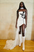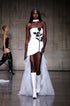 Bu mini elbise, askısız kesim ve büyüleyici kristal çiçek desenli süslemelerle çarpıcı asimetrik bir tasarıma sahiptir. Tülle kaplı kuyruk dramatik bir zarafet katarken, kontrast oluşturan süslemeler şıklığını artırıyor.