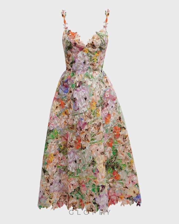 Bu diz altı slip elbise, çiçek desenli ve dantel işlemeli, kalp yakalı, romantik ve zarif bir görünüm yaratıyor. Tam dairesel etek hacim ve hareket katarken, hafif esnek kumaş mükemmel bir uyum sağlar.