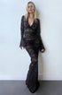 Derin V yakalı ve zarif dantel süslemeli, balık etekli siluetli maksi elbisemizle sofistike bir adım atın. Kontrast dantel fisto detayı ve uzun geniş kollar, asimetrik kol tasarımıyla birleşerek benzersiz ve zarif bir görünüm yaratıyor.